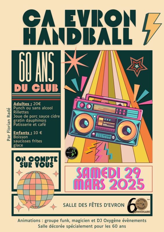 Le Hand de Evron 53 – A l’occasion des 60 ans du club, ils ont décidé de mettre les petits plats dans les grands pour vous surprendre et vous faire plaisir ! RDV le SAMEDI 29 MARS 2025 !